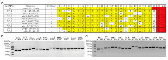 Ten target sites with high probability of sgRNA 6 in the genome were predicted (Figure 4A). By amplifying the target fragment containing each target site and T7EN1 enzyme digestion (Figure 4B), no detectable off-target effects were found at these sites (Figure 4C).