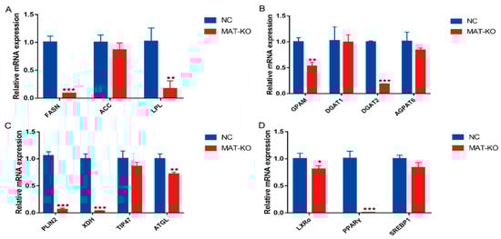 Effects of MAT-knockout on genes related to fatty acid metabolism. (A) Fatty acid synthesis and triacylglycerol hydrolysis. (B) Triacylglycerol synthesis (C) Lipid droplet formation, secretion and hydrolysis. (D) Regulatory factors. NC—negative control group; MAT-KO—knockout group; values are means ± SEM for three independent experiments. * p < 0.05, ** p < 0.01, *** p < 0.001.