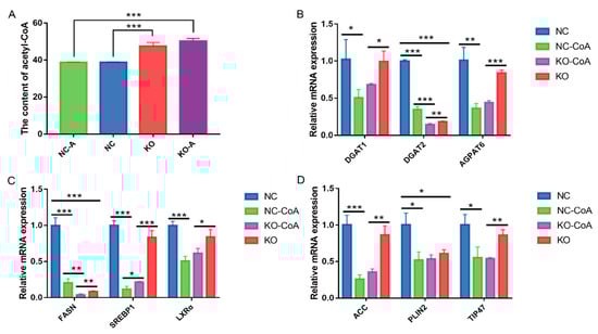 Acetyl-CoA suppresses the fatty acid anabolism. (A) Effect of MAT knockout on intracellular acetyl-CoA. NC-A—the control group added with acetyl-CoA; KO-A—the knockout group added with acetyl-CoA. (B–D) Effect of acetyl-CoA treatment on genes related to fatty acid synthesis. Values are means ± SEM for three independent experiments. * p < 0.05, ** p < 0.01, *** p < 0.001.
