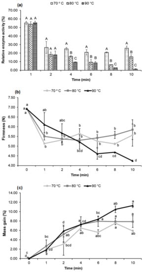 The temperatures of 70 and 80 °C caused less firmness loss; however, the increase in time and temperature to 90 °C more significantly influenced the decrease in firmness (Figure 1b and Table S2).