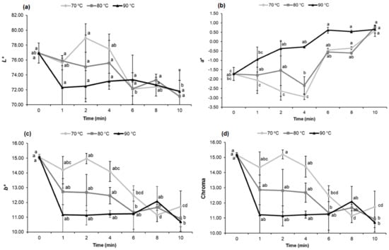 Effect of temperature and blanching time on color indexes (a) L*, (b) a*, (c) b* and (d) chroma of fresh cowpeas. Notes: Mean of two samples and standard deviation bar. Each sample was analyzed in triplicate. abcd Means with different letters in the same line differ significantly (p < 0.05) according to the Tukey test.