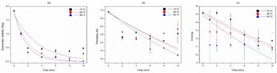 The denaturation of the enzyme with the increase in temperature can be elucidated by the biphasic character of isoenzymes. Most of the heat-labile fractions are inactivated in the initial phase, while only the heat-resistant fractions remain active in the final stage and requires an increase in exposure time and an increase in temperature to completely inactivate or decrease the REA as much as possible [].