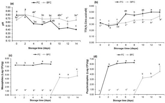 The pH of the BFC significantly differed (p < 0.05) from the control sample on day 0, with a lower value (Figure 4a and Table S5). However, it showed a significant increase (p < 0.05) after 2 days of storage which remained without major changes until the end of the storage period, being significantly (p < 0.05) higher than the pH of FC at times 4, 10, 12, and 14. Thus, the raw material is classified as a food with low acidity due to the presented pH values.