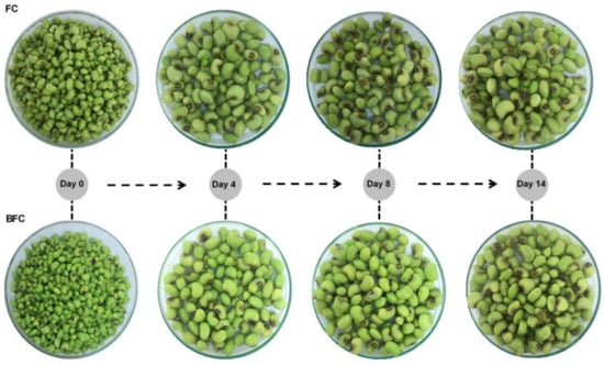 The control sample (FC) started the degradation processes from day 4 of storage with a compromise in the fresh cowpea structure, such as: shedding the integument and small oxidation in the halo, causing darkening. From the 8th day onwards, it was also possible to observe the appearance of wounds, foam formation, and changes in color, with more yellow grains due to the decrease in the chlorophyll pigment. The last day (14) presented rotting grains with more severe oxidation and darkening processes, wrinkling, softening, and viscous liquid (Figure 5).