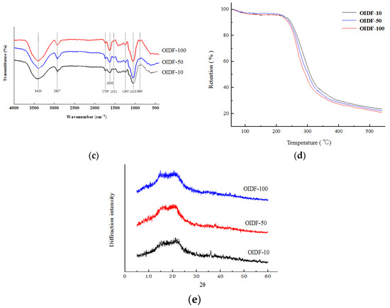 From Figure 1c, the FT-IR spectrum shows that the three particle sizes of OIDF have similar characteristic curve peaks, the broad peak at 3420 cm−1 is the stretching vibration peak of hydroxyl (-OH), and hydrogen bonds in cellulose and hemicellulose [25] are a characteristic band of all cellulose. The absorption peak at 2927 cm−1 is the stretching vibration peak on the carboxymethyl group and methylene group (-CH) in hemicellulose [26]. Characteristic absorption peaks at 1739 cm−1 and 1630 cm−1 are due to the asymmetric stretching vibrations of C=O of acetyl groups or esters, including methyl esterification or free carboxyl groups [27]. As the particle size decreases, the intensity of the absorption peak gradually weakens, which may be due to the destruction of some ester structures during the grinding process. There is also literature showing that the weakening of the absorption peak here will lead to a poor water holding capacity [28], which provides a theory for water holding research. The absorption peak at 1531 cm−1 is the characteristic absorption peak of C=O in the imide bond; the absorption peak at 1245 cm−1 is the vibration of the OH or -CO group of hemicellulose, and 1053 cm−1 is the C-O-C stretching vibration peak. The absorption peak at 890 cm−1 is the characteristic absorption peak of the β-configuration glycosidic bond [29]. To sum up, compared with the characteristic peaks of OIDF-50 and OIDF-100, the peak shape, position and number of OIDF-10 did not change significantly, indicating that the main components and structure of OIDF did not change substantially after DHPM treatment.
