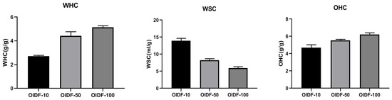 Effects of different particle sizes of OIDF on the water holding capacity (WHC), swelling capacity (WSC) and oil holding capacity (OHC).