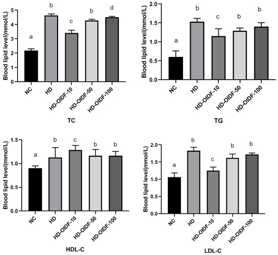 Effects of different particle sizes of OIDF on blood lipid levels in rats (TC, TG, HDL-C, LDL-C). Different letters in the same column (a, b, c and d) are significantly different (p < 0.05). The results are expressed as mean ± SD (n = 3).