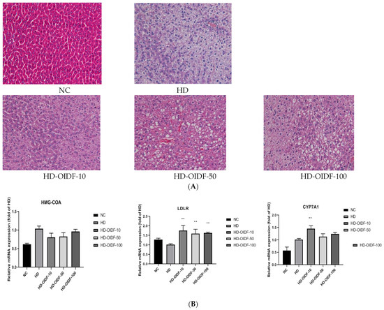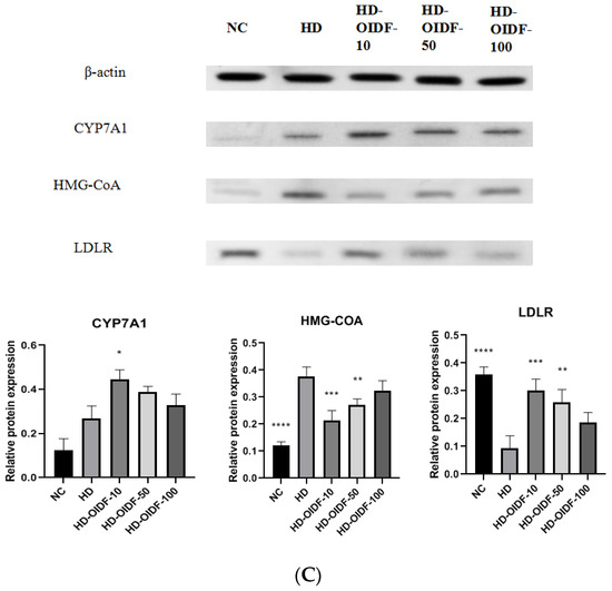 As shown in Figure 5B, RT-PCR was performed on the mRNA levels of three key genes of 3-hydroxy-3-methylglutaryl coenzyme (HMG-CoAr), Cholesterol 7α-hydroxylase (CYP7A1), and Low-density lipoprotein receptor (LDL-R) in rat liver. HMG-CoAr is a key rate-limiting enzyme for cholesterol synthesis. From the mRNA expression level of the gene, the relative expression of HMG-CoAr gene in the HD group was up-regulated in the NC group, indicating that a high-fat diet would increase the synthesis of cholesterol. This result was consistent with the results of lipid expression in serum and liver of HD group. As shown in Figure 5B,C, the effect of PCR was not significant. Combined with the analysis of the translation level Western Blot data, high-fat feeding in the HD group led to the high expression of HMG-CoAr gene, and OIDF intervention could reduce its expression, of which OIDF-10 had the most reduction effect. LDL-R can mediate the endocytosis of LDL and reduce the synthesis of hepatic cholesterol by increasing the reabsorption of LDL [40,41]. Therefore, the up-regulation of LDL-R in the OIDF-10 group may be due to the decrease in the blood lipid level of LDL-C. After eight weeks of OIDF dietary intervention, the expression level of CYP7A1 gene in the HD-OIDF-10 group was significantly higher than that in the HD group. Some researchers believe that FXR can activate bile acid synthesis by inducing the expression of CYP7A1 [42]. The high expression of the gene may promote the synthesis of bile acids, thereby promoting the metabolism of cholesterol.