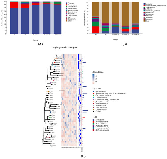 By statistic on the ASV/OTU table after leveling, the specific composition table of the microbial community in each sample at each classification level can be obtained. Through this table, the number of taxa contained in different samples at each taxonomic level can be calculated first. Analysis software: QIIME2 (2019.4); Personal company self-compiled perl script. Analysis step: According to the results of the sequence species taxonomic annotation and the selected samples, we can count the number of taxa contained in each of the seven taxonomic levels of domain, phylum, class, order, family, genus, and species in the species annotation results of these samples. Some studies have used Firmicutes/Bacteroidetes ratios to explore the degree of obesity [43]. Compared with the HD group, the HD-OIDF-10 group was able to significantly reduce the ratio of Firmicutes/Bacteroidetes. As shown in Figure 6A and Table 3 (percentages shown in Table 3 are the mean value), at the phylum level, Firmicutes NC group accounted for 80.32%, HD group accounted for 80.67%, HD-OIDF-10 group accounted for 88.25%, HD-OIDF-50 group accounted for 93.04%, HD-OIDF-100 group accounted for 90.64%. Firmicutes are the dominant beneficial bacteria in the intestinal tract, indicating that OIDF with different particle sizes can increase the abundance of the Firmicutes after the intervention of a high-fat diet. Regarding Bacteroidetes, the NC group accounted for 1.27%, the HD group 0.03%, the HD-OIDF-10 group 4.44%, the HD-OIDF-50 group 2.34%, and the HD-OIDF-100 group 2.06%. Bacteroidetes are engaged in colonic metabolism, including glucose fermentation and bile acid and steroid biotransformation, and their numbers have grown. In the HD group, a high-fat diet resulted in a significant reduction in Bacteroidetes. The proportion of Bacteroidetes rose after OIDF intervention, notably in the HD-OIDF-10 group. The OIDF-10 intervention might dramatically reduce the rise in Actinobacteria and Proteobacteria produced by a high-fat diet when compared to the NC group. At the genus level, as shown in Figure 6B, Oscillospira showed the largest quantitative difference among the groups, and Oscillospira was able to produce short-chain fatty acids (SCFAs) such as butyrate, suggesting that it may play an essential role in various aspects of human function and health [44]. At the same time, studies have shown that Oscillospira can ferment complex plant carbohydrates [44]. After the intervention of three particle sizes of OIDF, the content of Oscillospira in the HD-OIDF-10 group was the highest at 20.25%, which was significantly higher than that in the HD group by 2.4 times. It shows that the bacteria in the gut can obtain carbon sources by decomposing the plant polysaccharide OIDF. As shown in Figure 6C, the elements of the phylogenetic tree graph mainly include: the phylogenetic tree graph, coloring ASV characteristic sequences or OTU representative sequences (tips in the graph) according to the taxonomic level. The first column is the sequence ID, and the second column is the relative abundance of the sequence in each sample of the grouping scheme. From left to right are the HD group, the NC group, the OIDF-10 group, the OIDF-50 group, and the OIDF-100 group, with six samples in each group. As shown in Table 3, at the genus level, OIDF was also able to modulate gut microbiota composition, enabling the development of gut microbiota towards a healthy state, reducing the abundance in Allobaculum bacteria in the gut of rats on a high-fat diet. Ruminococcus, ruminant digestive tract flora, is fermented to produce lactic acid, and the OIDF was able to increase Ruminococcus abundance, of which OIDF-10 had the most significant effect, possibly through the production of lactate, which is produced by gut bacteria, making a valuable contribution to colon health. It helps promote gut health and the bacteria that produce it protect against disease.