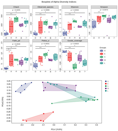 3.7. Alpha Diversity Index and Beta diversity PCoA Analysis