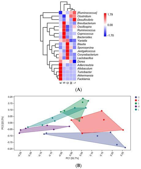 Species differences and marker analysis: (A) Species composition heatmap; (B): PCA analysis; (C): MetagenomeSeq analysis. (G: HD group; K: NC group; S: HD-OIDF-10 group; M: HD-OIDF-50 group; L: HD-OIDF-100 group).