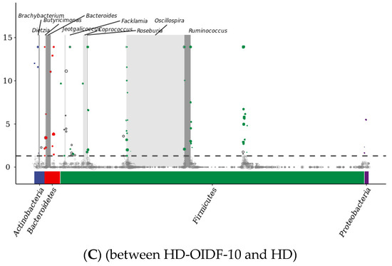 As shown in Figure 8A, cluster analysis was performed between each group, and the top 20 bacterial species were obtained, which were Ruminococcus, Clostridium, Desulfovibrio, Brevibacterium, Oscillospira, Ruminococcus, Coprococcus, Bacteroides, Yaniella, Blautia, Sporosarcina, Jeotgalicoccus, Corynebacterium, Lactobacillus, Dorea, Adlercreutzia, Allobaculum, Turicibacter, Akkermansia, Facklamia. Compared with the HD group, HD-OIDF-10 group increased the abundance of Brevibacterium, Oscillospira, Ruminococcus, Coprococcus, Bacteroides, Yaniella, and HD-OIDF-50 increased the abundance of Ruminococcus, Clostridium, HD-OIDF-100 compared with HD group increased the abundance of Ruminococcus, Clostridium, Desulfovibrio, Oscillospira, Ruminococcus, Bacteroides compared with the HD group, indicating that the OIDF can improve the dysbiosis caused by a high-fat diet. As shown in Figure 8B, in the PCA analysis, PC1 = 52.7%, PC2 = 22.2%, and the differences in PCA analysis between groups were significant. The HD-OIDF-10 group and the HD group with extremely significant differences were selected for MetagenomeSeq analysis, and the occurrence frequency of ASV was greater than or equal to 0.3 as the condition, as shown in Figure 8C. The sample groups were compared using the metagenomeSeq method. This method avoids the influence of data sparse (Rarefaction) process on the accuracy of results, and is especially suitable for sparse microbial composition data. The dotted line separated the significant difference (above) and the insignificant ASV, significant difference. The points are marked by colored dots or circles, gray circles indicate the insignificant ones and the significantly up-regulated ones in this group are indicated by colored solid circles. The color of the dots identifies its phylum level name and is marked at the bottom of the figure; for the top 10 genera with significantly up-regulated points, a grayscale background is added, and the final analysis shows that the difference ASV number is 62, and after classification, it is concentrated in Actinobacteria, Bacteroidetes, Firmicutes, Proteobacteria.