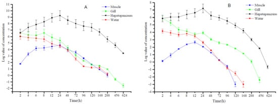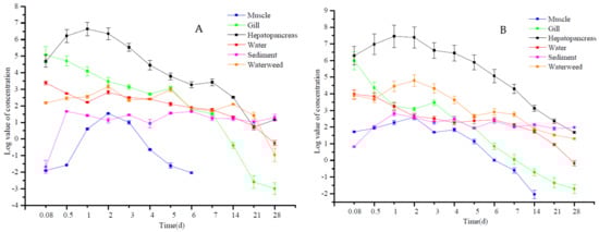 Log values for pendimethalin concentrations in the indicated tissues sprayed on outdoor test ponds at (A) 0.27 and (B) 0.14 mg/L.