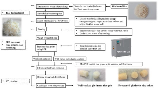 Figure 1. Schematic flowchart for the preparation of rice gel samples and rice cake samples made from glutinous rice grains with or without PEF treatment.