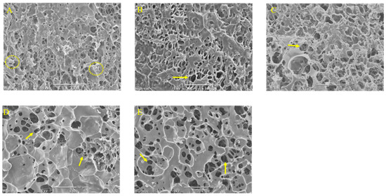 Figure 2. SEM images of steamed glutinous rice grain surface without PEF treatment (Control, (A)), and with 100 (B), 200 (C), 300 (D), and 400 (E) pulses of PEF treatment. Insufficient gelatinized starch particles were circled (A). Arrows indicate the pores or cavities on the PEF-treated rice grain surface. The SEM images captured for all samples provided a 500× magnification and used the scale bar of 50 μm.