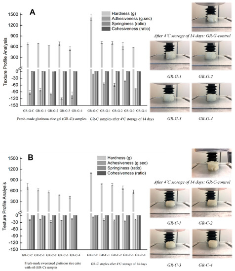 Figure 3. Textural properties of the freshly cooked and 14-day stored at 4 °C glutinous rice gel (GR-G) samples (A) and sweetened glutinous rice cake (GR-C) samples (B), and visual images of the stored GR-G and GR-C samples after TPA testing. The GR-G and GR-C samples were prepared using rice grains without PEF treatment (GR-G-control, GR-C-control), and with 100 (GR-G-1, GR-C-1), 200 (GR-G-2, GR-C-2), 300 (GR-G-3, GR-C-3), and 400 (GR-G-4, GR-C-4) pulses of PEF treatment. Each plotted point represented the average of five trials ± SD.