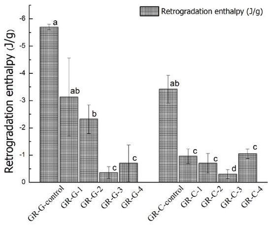 Figure 4. The retrogradation enthalpy after 14 days of storage at 4 °C of control glutinous rice gel sample (GR-G-control) and control sweetened glutinous rice cake (GR-C-control) and rice samples with 100 (GR-G-1, GR-C-1), 200 (GR-G-2, GR-C-2), 300 (GR-G-3, GR-C-3) and 400 (GR-G-4, GR-C-4) pulses of PEF treatment at 3 kV/cm. Mean values ± standard deviation of triplicates. Different letters on the bar graph indicated significant differences among the enthalpy of the samples (p < 0.05).