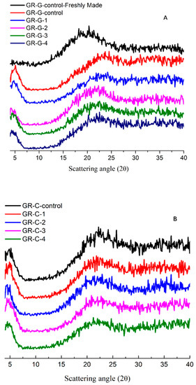 Figure 5. Separated X-ray diffractograms of glutinous rice gel sample (A) and sweetened glutinous rice cake samples (B). GR-G-control, GR-G-1, GR-G-2, GR-G-3, GR-G-4 represented that rice gel samples after 14 days of storage at 4 °C, made of 0, 100, 200, 300, 400 pulses of 3 kV/cm PEF treated rice grains, respectively; GR-C-control, GR-C-1, GR-C-2, GR-C-3 and GR-C-4 represented that rice cake samples after 14 days of storage at 4 °C, made of 0, 100, 200, 300, 400 pulses of 3 kV/cm PEF treated rice grains, respectively. GR-G-control-Freshly Made represented the freshly made control rice gel sample.