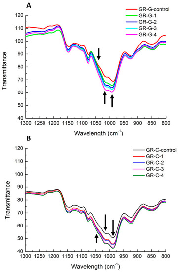 Figure 6. Overlay FTIR spectra of control glutinous rice gel (A) sample (GR-G-control) and control sweetened glutinous rice cake (B) sample (GR-C-control) and rice samples with 100 (GR-G-1, GR-C-1), 200 (GR-G-2, GR-C-2), 300 (GR-G-3, GR-C-3) and 400 (GR-G-4, GR-C-4) pulses of PEF treatment at 3 kV/cm after 14 days of storage at 4 °C at the regions of 1300–800 cm−1. Arrows indicate the peaks at the wavelength of 995, 1022 and 1047 cm−1 respectively.