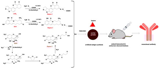The schematic of developed MAb for AFB1, ZEN, and DON. Hapten 1, Hapten 2, and Hapten3 are hapten of AFB1, ZEN, and DON, respectively. The semi-antigens were coupled with BSA to obtain immunogens, and antibodies were obtained by immunization in mice.