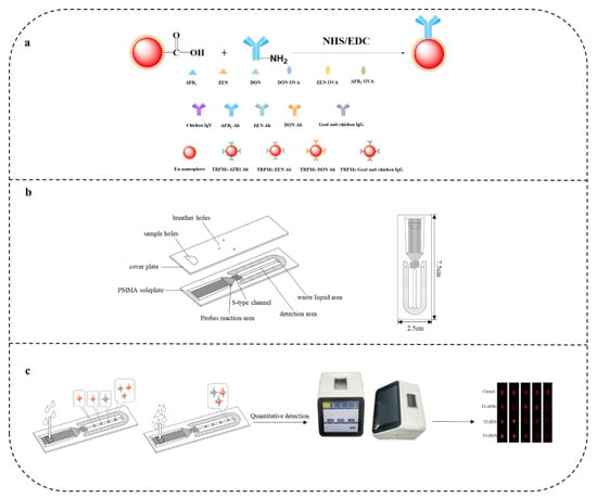 Schematic diagrams of the microfluidic chip for AFB1/ZEN/DON, and interpretation of test results: (a) principles of immunoprobe preparation; (b) schematic diagram of microfluidic chip; (c) detection principle of microfluidics chip; the EM wavelength of fluorescent microspheres was 365.0 nm, the EM wavelength was 650 nm, and the scanning range was from 500.0 nm to 700.0 nm.
