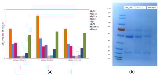 After mouse cell fusion and limiting dilution, three monoclonal antibodies were isolated. These three monoclonal antibodies were antibody 4C9 for AFB1, antibody 2A3 for ZEN, and antibody 1F10 for DON. The isotype analysis kit revealed that the MAb generated belonged to the IgG subclass (Figure 3a). The electropherogram revealed distinct bands of heavy chain (about 55 kDa) and light chain (approximately 25 kDa) MAb (Figure 3b). The AFB1/ZEN/DON MAb concentration was 8.91/10.57/13.55 mg/mL, as determined by a NanoDrop ultraviolet spectrophotometer.