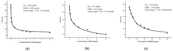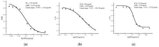 The inhibition curve of ic-ELISA: (a) AFB1; (b) ZEN; (c) DON (AFB1-OVA, ZEN-OVA, and DON-OVA were diluted and added to the wells of microtiter plates, and the coating buffer was 0.05 M carbonate buffer (pH 9.6). The reaction was carried out using 50 μL of MAb and HRP- IgG (1:5000) at 30 min, 37 °C).