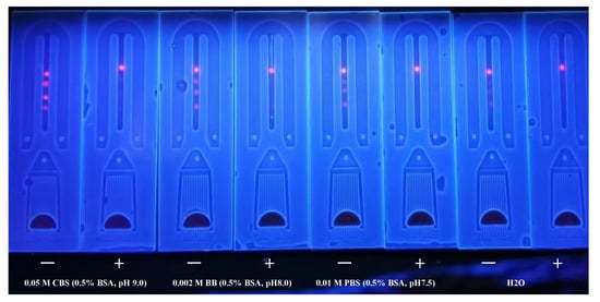 To dilute MAb, three antigen dilution buffers were used: 0.05 M CBS (0.5% BSA, pH 9.0); 0.002 M BB (0.5% BSA, pH 8.0); 0.01 M PBS (0.5% BSA, pH 7.5); and H2O. The results (Figure 6) showed that 0.05 M CBS reached the necessary fluorescence intensity and inhibitory effect for each line. As a result, we settled on 0.05 M CBS as the buffer for further investigation.