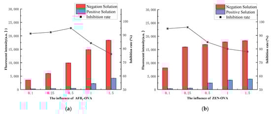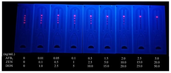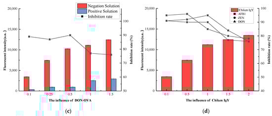Coated antigens have a direct impact on detection performance. When the coating antigen is too low, it reduces the fluorescence intensity of the detection area, resulting in reduced sensitivity. Finally, as shown in Figure 7a–c, the addition ratios of Chicken IgY, AFB1-OVA, ZEN-OVA, and DON-OVA were adjusted and Chicken IgY (1 mg), AFB1-OVA (0.5 mg), ZEN-OVA (0.25 mg) and DON-OVA (0.5 mg) were selected as the most suitable addition amounts for antigen encapsulation.