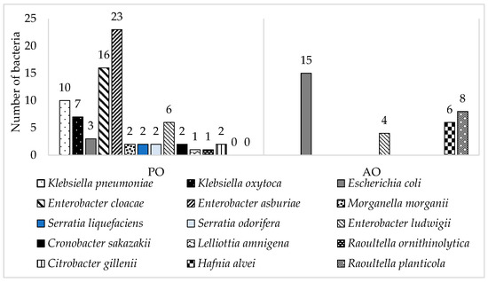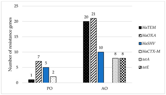 In half (47%) of the isolates, a registered presence of more than one resistance gene was observed (Table 4). All strains of E. ludwigii of AO, two H. alvei, and one E. coli isolate from the samples from raw milk, posed blaTEM and blaSHV simultaneously. A combination of blaSHV and blaOXA was reported only in one case of K. pneumoniae of PO. Eighty-nine percent (16) of all isolated E. coli has posed various resistance genes, and in 31%, a combination of the blaTEM and blaOXA genes. Regarding E. coli, a combination of OXA-type and TEM-type β-lactamases has been observed as the most frequent plasmid-borne enzymes associated with resistance to common medical therapy by amoxicillin–clavulanic acid drugs [45,73].