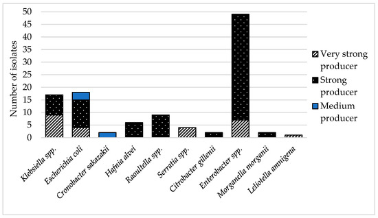 Biofilm: Biofilm can be described as the formation of a population of mono- or multispecies colonies adhering to a surface [22]. The comparison of parallel analyzes of each isolate did not reveal a significant difference (p < 0.005). The results of the biofilm formation detection showed that 73% of resistant coliform bacteria were strong biofilm producers. As Figure 2 shows, most of them was Enterobacter spp. Twenty-three percent of isolates were evaluated as very strong producers of biofilm. The isolates that formed very strong biofilm were predominantly Klebsiella spp. (36%) and Enterobacter spp. (28%). The rest of the very strong producers were Serratia spp. (16%) and E. coli (16%), plus one isolate of L. amnigena. A moderate ability to form biofilm was detected in 4% of cases, specifically 40% in C. sakazakii and 60% in isolates E. coli. None of the resistant isolates were detected to be low producers of biofilm. The ability to adhere to surfaces is a very important property of infection-causing bacteria in humans [24]. The majority of chronic or recurrent human infections are caused by bacterial biofilms, and K. pneumoniae or E. coli are a common source of such diseases [22]. In this study, K. pneumoniae was very strong biofilm producer. This bacterium is mainly responsible for respiratory tract diseases [64], and the ability to form biofilm makes them even harder to cure. All strains were isolated from smoothie drink samples, which may represent a serious problem due to the preparation of such foodstuffs. Mixing the ingredients together generates aerosols containing microbes, which are easy to transport to the respiratory system of the handler.