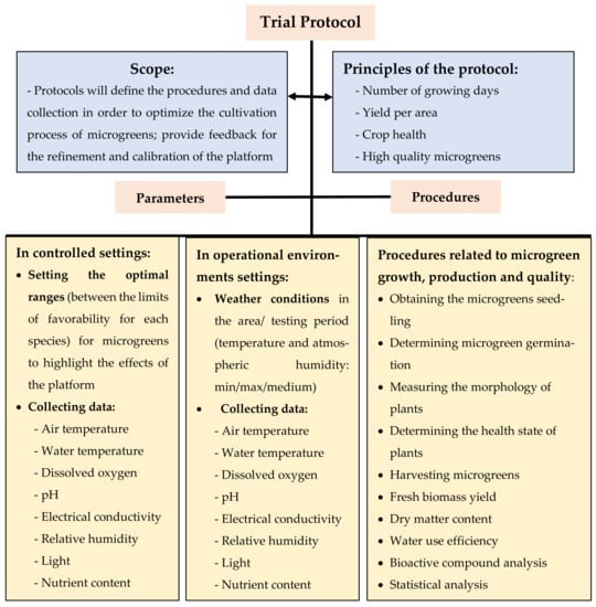 The trial protocol for evaluating platforms for growing microgreens in hydroponic conditions includes the procedures to be followed and the parameters considered useful for calibrating the platform.