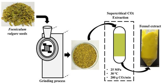 Figure 1 illustrates the experimental procedures for obtaining the lipophilic bioactive compounds from fennel. The fennel seeds were acquired in the Mercado Municipal de Campinas (São Paulo, Brazil). The seeds were ground in a model MA-340 knife mill (Marconi, Piracicaba, Brazil). Afterward, the particle size distribution was determined in a model 1868 vibratory system (Bertel, Caieiras, Brazil) using sieves from 9 to 80 mesh (Tyler series, Wheeling, WV, USA). The mean particle diameter of the fennel seeds was 0.97 mm. The ground particles were stored at −18 °C until the extraction assays.