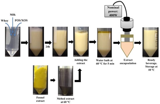 The whey beverage production was divided into two stages: ingredients preparation and the encapsulation of fennel extract, as shown in Figure 2. Initially, the prebiotic fiber was dissolved in water. FOS was dissolved in hot water (70 °C) and cooled to room temperature. The other ingredients were then incorporated using a vortex mixer (Sinergia, São Paulo, Brazil). The suspensions were stored at room temperature for 24 h to ensure molecule saturation of the materials. The fennel extract was melted in a water bath at 60 °C and homogenized in a vortex for 6 s before its addition to the formulation. The mixture of ingredients was also placed in a water bath (60 °C) for 5 min, and the extract was incorporated into the beverage. The sample was sonicated at a nominal power of 400 W for 3 min to carry the fennel extract in the dairy system using a 13 mm ultrasonic probe at 19 kHz (Unique, Indaiatuba, Brazil). For this nominal power, the ultrasound equipment provided to the samples an acoustic power of 20 ± 1 W [36]. The encapsulation process was carried out at 25 °C.