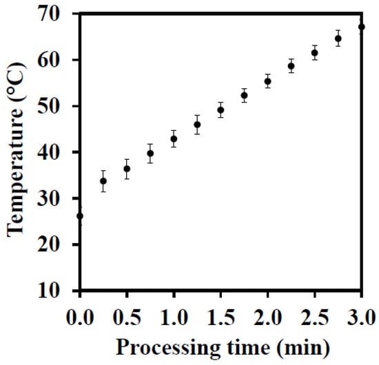 Figure 4 presents the thermal history of the fennel-based whey beverages during their thermosonication treatment. All of the whey beverages, standard, FOS, and XOS, presented the same thermal history due to their similar formulation. Thermal history describes how the beverage temperature changes as a function of the thermosonication treatment. All whey beverages were manufactured employing the acoustic energy provided by an ultrasonic probe for emulsifying the lipophilic bioactive compounds from fennel obtained by the supercritical CO2 extraction technique. In the emulsification step, the samples achieved up to 68 ± 1 °C according to their thermal history (Figure 3).