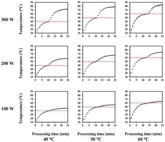 For the thermosonication treatments, the initial temperature of the whey beverages was set to 10 °C. The holding time for thermosonication treatment refers to the heating time of the samples, starting from 10 °C, until reaching the working temperature (40, 50, and 60 °C), that is, the thermosonication temperature. Therefore, the holding time was the time for which the beverage was heated to reach the working temperature, and the processing time was the time that had elapsed since the beginning of ultrasound treatment. The red dotted line indicates the working temperature. In this regard, the crossing of the red dotted lines with experimental points indicates the beginning of the sonication treatment. The combined effect of the heat treatment and acoustic energy on the temperature increase of the whey beverages during their processing (Figure 4) demonstrated that the nominal power and working temperature had a strong impact on the temperature profile. Increasing the levels of both process variables increased the maximum temperature reached by the samples. The greater ΔT (maximum temperature - working temperature) values were observed for the thermosonication treatments applying 300 W. For this nominal power, ΔT values of 32, 28, and 24 °C were observed for working temperatures of 40, 50, and 60 °C, respectively.