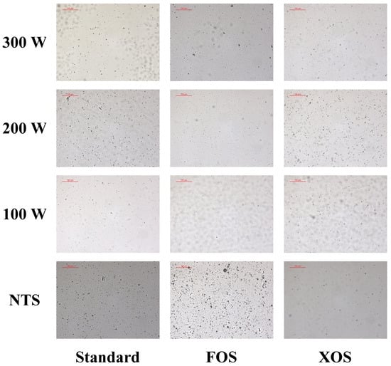 Impact of the thermosonication treatments and dietary fibers on the microstructure of the whey beverages. NTS: Non-thermosonicated. FOS: fructooligosaccharides. XOS: xylooligosaccharides.