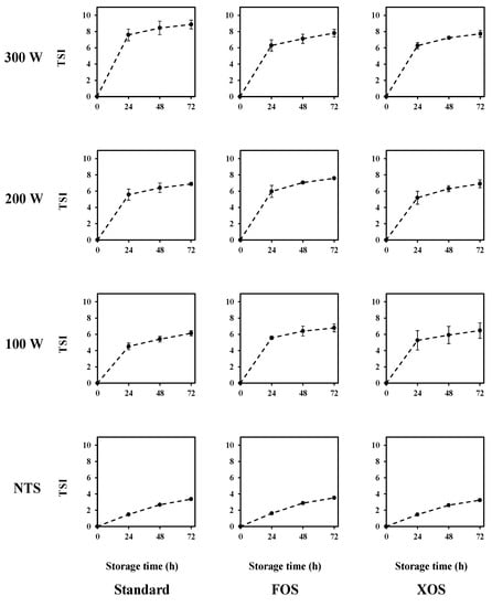 The influence of nominal power and prebiotic dietary fibers on the kinetic stability of the whey beverages is presented in Figure 6. Turbiscan Stability Index (TSI) values were used for comparing the kinetic stability of the samples during their cold storage at 4 °C for 72 h. TSI values were obtained from the sum of all destabilization processes that occur in the measuring cell. Thus, the higher the TSI values, the greater the whey beverage destabilization. The maintenance of colloidal stability is an important technological property for dairy beverages. In this study, the kinetic stability strongly impacts functional activity because the whey beverages are carrying systems for the supercritical fennel extract.