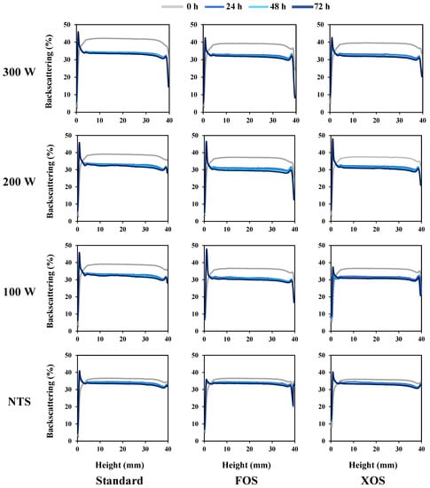 Impact of the thermosonication treatments and dietary fibers on the backscattering profile of the whey beverages. NTS: Non-thermosonicated. FOS: fructooligosaccharides. XOS: xylooligosaccharides.