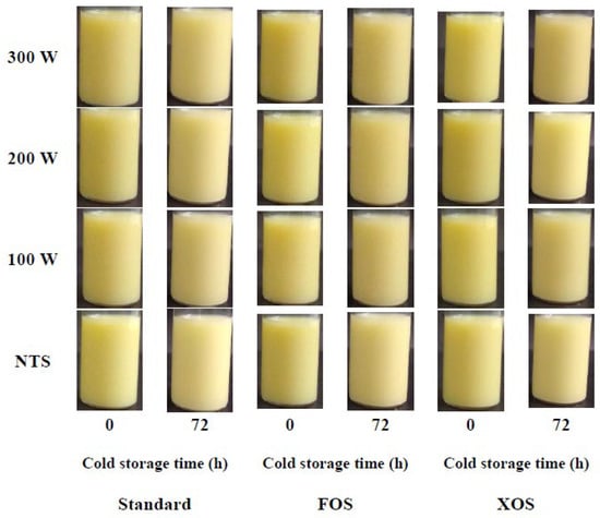 According to the results exhibited in Figure 6, the beverage supplementation with FOS and XOS did not affect the kinetic stability of the fennel-based whey. Both formulations presented similar behaviors for the evolution of TSI values during their cold storage. However, thermosonication treatments, for all nominal powers evaluated, increased the TSI values. A similar trend was observed for all treatments at the same nominal power, but the increase in nominal power for the same formulation presented a slight increase in the TSI values over the cold storage time. A similar trend was verified for the results of the backscattering (BS) profile of the samples (Figure 7). The BS (%) values are presented from 0 to 40 mm. For all samples at the different cold storage times, the BS (%) values were constant along tube length, indicating a uniform droplet size distribution. Both whey beverages had their BS (%) values decreased after 24 h. However, after that, the BS (%) values remained the same until 72 h. BS values can be correlated to the droplet size. For droplets higher than the incident wavelength (880 nm), BS values are inversely proportional to the droplet size [49]. Thermosonication treatments increased the initial BS (%) values, but after the storage time (equilibrium time), all samples presented a similar BS (%) value. The visual appearance of the fennel-based whey beverages right after their manufacturing and after their cold storage for 72 h are presented in the Figure 8. The pictures confirm the kinetic stability of the samples according to the results obtained by the multiple light-scattering technique.