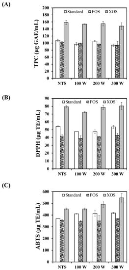 Regarding the DPPH• results for the standard beverage, the thermosonication treatments applying 100 W and 200 W promoted a slight decrease in the antioxidant capacity. However, the thermosonication with 300 W presented the same antioxidant capacity as the non-thermosonicated standard sample. For the beverage supplemented with XOS, only the thermosonication treatment with 100 W reduced the antioxidant capacity regarding other treatments. On the other hand, FOS-enriched beverages presented the same antioxidant capacity for all treatments. Despite the significant differences detected by the ANOVA test, the results demonstrated that the whey beverages’ antioxidant capacity, as measured by the DPPH• assay, was preserved after the thermosonication treatments at 60 °C from 100 W to 300 W. Similar to the TPC results, the XOS-supplemented beverage presented a better performance on antioxidant capacity due to the phenolic acids used during the manufacturing of XOS. Concerning the ABTS•+ assays, the thermosonication treatments increased the antioxidant capacity of the standard beverage and did not affect the beverage enriched with FOS. The XOS-enriched beverage had its antioxidant capacity increased by the thermosonication treatments with 200 W and 300 W. Again, the ingredient XOS potentialized the antioxidant capacity due to its residual content of phenolic acids.