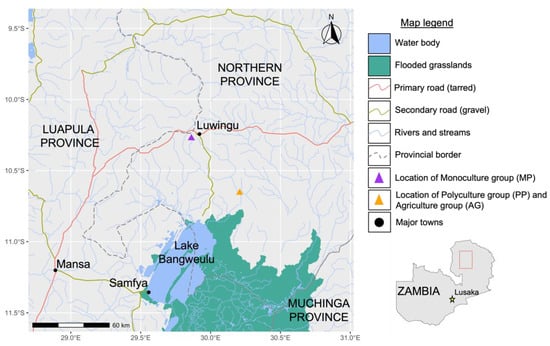 Map of study site locations in Northern Province, Zambia. Data for the flooded grasslands biome is from Terrestrial Ecoregions of the World (TEOW) [41]. Rivers and water bodies are from the HydroATLAS [42]) and HydroATLAS-Zambia [43].
