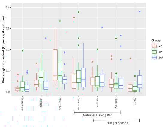The total quantity of fish consumed per capita over the whole study period was relatively the same for the three groups, pointing to people’s ability to find ways to satisfy their protein needs, in this case in the form of fish. The MP group managed to maintain a more consistent consumption of fish compared to the decreasing consumption experienced by the AG and PP groups. As a result of the national fishing ban, the latter groups almost doubled their fish consumption per capita in November in preparation for the inevitable decline in fish supplies starting in December, or for other unknown reasons to do with food availability during this time. This may be seen as indirect proof that fisheries management strategies are, indeed, successful in decreasing fishing activities and supplies. In anticipation of the ban, however, fishing pressure seems to increase in November, thus affecting the net impact that the ban may have on fish stocks. This study did not aim to assess the impact of the national fishing ban and other causes for this decline should be considered, such as the reduced catch per unit effort, resulting from an increase in rain and water levels making it difficult to access fishing grounds, especially in wetland swamps. Regardless, there was a clear trend of decreasing fish supplies experienced by all groups during this time, which is also regarded as the beginning of the “hunger season” for many poor and vulnerable Zambian families [45]. Such a drop in fish supplies, a primary animal-source food in this area, could exacerbate food and nutrition insecurity.