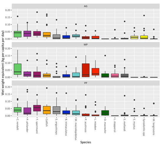 This is better represented in Figure 3, which shows the same average quantity of wet weight equivalent (kg) fish per capita per day, disaggregated by group and source. The total weight of fish consumed and not the weight of the edible portions is given, although small fish were generally consumed whole. The PP and MP group members sourced between 10 to 20 g of fresh fish per capita per day from their ponds. The AG group members, who did not have ponds, sourced roughly double that from capture fisheries, and many of the species were the same as the ones found in the ponds of the PP and MP groups.