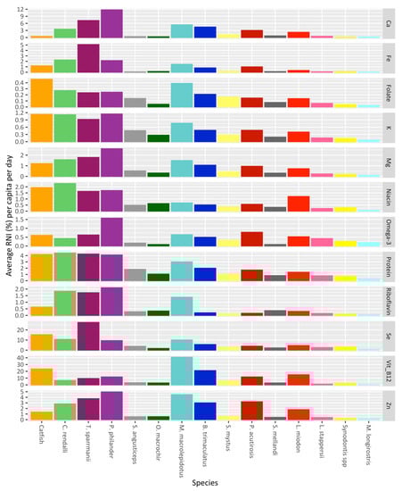 Average consumption of each nutrient per species as a percentage of the recommended nutrient intake (RNI) achieved for each nutrient per capita per day. From left to right, the species are ordered as the most to least consumed fish for the whole sample of households over the entire study period, in terms of the total weight (kg) of fish (i.e., not the wet weight equivalent).