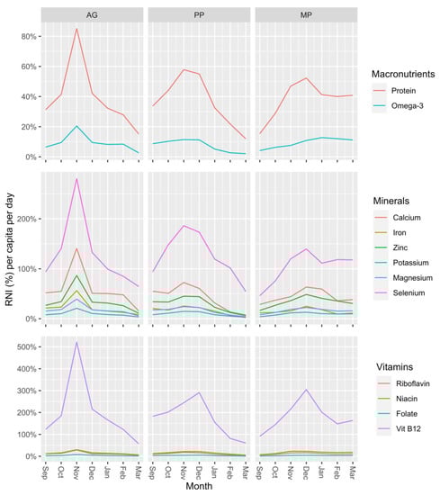 Figure 6 shows the percentage of the RNI reached for each nutrient over time as an average per person per day for each study group. Overall, the entire sample achieved a daily average of 34.6% of their recommended protein intake, 8.6% of their recommended omega-3 fatty acids intake, and 48.2% of their recommended calcium intake. Participants in the study achieved almost double the daily recommended intake for vitamin B12 and selenium, on average. Since fish is known to contain high concentrations of these micronutrients, it is common for people to overreach the daily recommendation [52]. Over time, during the study period, the percentage of RNI achieved for most nutrients decreased, with the AG and PP groups experiencing the largest decreases from December onward. The MP group managed to avoid such a decrease, especially in their intake of omega-3 fatty acids. This was because of the high contribution of the pelagic fish, purchased from stocks caught from capture fisheries that are located further away, and because of the overall quantity consumed by the MP group (see Figure 3 and Figure 4).