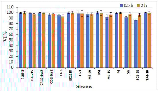 The resistance to gastric juice was evaluated by calculating the Viability Index (VI, %) in Gastric Juice (GJ), simulating of the stomach conditions, after 0.5 h and 2 h of incubation (Figure 2). After 30 min, the SC5-25 strain exhibited the lowest VI (87.35% ± 0.92), whereas the highest VI (100%) was found in four strains (CA10-4sc2, EC1118, M4 and TA4-10). After 2 h, the exposure time to stomach acidic conditions recommended by different authors [22,68], the surviving level of the strains remained almost unchanged for the majority of the strains, whereas a slight increase of VI was observed for some of them, such as M5-15, Sb, SC5-25.