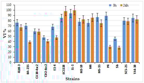 As regards the simulation of the intestinal transit, high variability among the analyzed yeasts was found for strain survival level to the simulated intestinal fluid (Figure 3). After 3 h, all the strains showed a VI > 50%, except the control strain Sb (45.36% ± 3.25) and CD2-6sc2 (47.89% ± 3.25). In particular, five strains exhibited a VI > 80% [EC1118 (84.80% ± 7.15), M5-15 (86.56% ± 7.55), P4 (89.05% ± 7.36) and TA4-10 (84.90% ± 7.63)] and LL-1 strain showed the highest VI (93.77% ± 8.06). After 24 h, a certain viability loss was observed for all the strains, except for EC1118 (84.80 to 98.30% ± 8.88), LL-1 (93.77 to 99.98% ± 8.95), M3-59 (from 77.61% ± 6.54 to 82.35% ± 7.14) and M4 (from 75.84% ± 6.39 to 85.76% ± 7.39). Two strains exhibited a viability loss of about half between 3 h and 24 h incubation, which were BA-215 (69.59% ± 5.43 to 38.84% ± 2.54) and P4 (89.05% ± 7.36 to 30.00% ± 2.94). These results showed the existence of high differences among the analyzed strains, confirming results previously reported by other authors that probiotic capacities are strain dependent [65,69,70]. The indigenous strains, characterized by higher resistance to digestive enzymes, such as pepsin, pancreatin as well as bile salts, than the commercial probiotic strain, demonstrating to be able to survive GI transit, can represent new microorganisms possibly affecting the microbial balance in the human body.