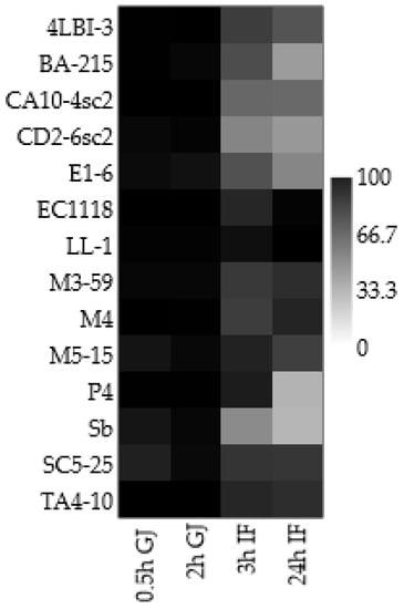 Matrix plot based on the evaluation of simulation of the transit into gut of the 14 Saccharomyces cerevisiae strains. The results are reported as Viability Index and expressed with a colour scale, where black indicate the highest Viability Index (VI) and light grey the lowest value. Data were reported as means of two independent experiments. 0.5 h and 2 h GJ = strain VI in Gastric Juice (GJ) after 0.5 h and 2 h of incubation, respectively; 3 h IF and 24 h IF = strain VI in intestinal fluid (IF)) after 3 h and 24 h of incubation, respectively.