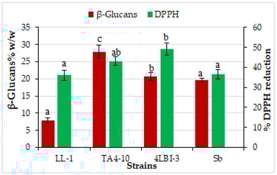 Determination of β-glucan content (%w/w) and antioxidant activity (%DPPH reduction) in four Saccharomyces cerevisiae strains. Letters on plot bars indicate significant differences (p < 0.05) among the four selected strains for each parameter. Data are expressed as mean value ± SD of two independent experiments.